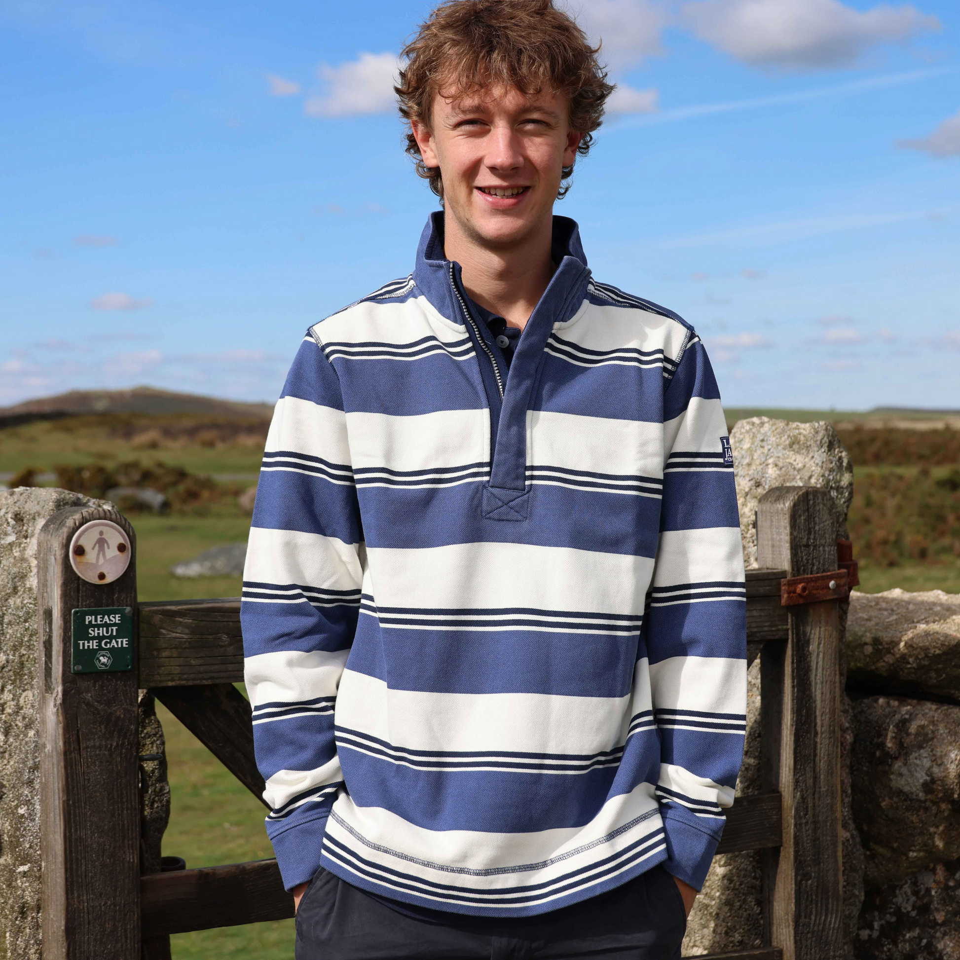 The bold denim and navy stripe pattern adds a classic coastal touch, while the quarter-zip neckline and contrast inner collar give it a refined look. Whether you’re heading for a seaside stroll, a casual weekend outing, or just relaxing at home, this versatile striped sweatshirt keeps you warm and effortlessly stylish.