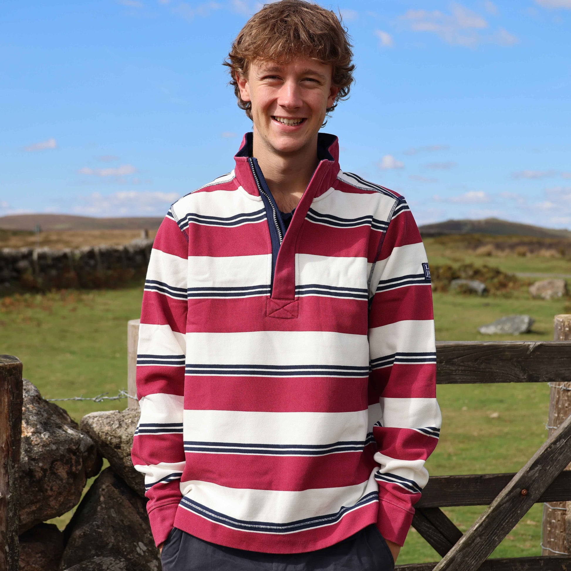The bold rouge and navy stripe pattern adds a classic coastal touch, while the quarter-zip neckline and contrast inner collar give it a refined look. Whether you’re heading for a seaside stroll, a casual weekend outing, or just relaxing at home, this versatile striped sweatshirt keeps you warm and effortlessly stylish.